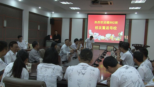 建环992班的员工们穿着统一的白色文化衫,重走了南湖校区昔日就读的教学楼和宿舍,游览了绿树成荫的新校区。员工对公司发生的变化表示赞叹。