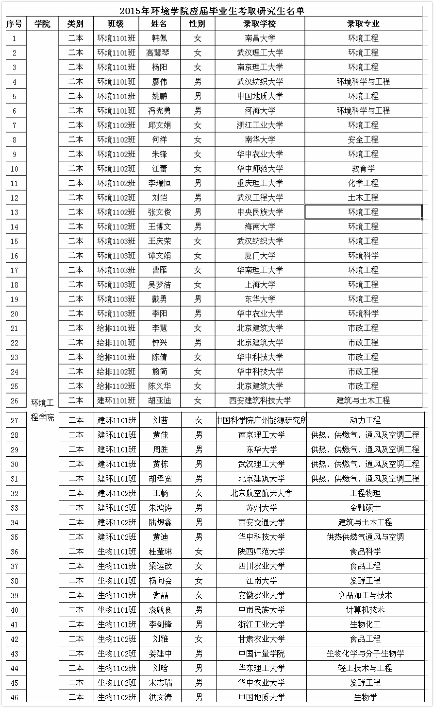 随着2015年考研复试陆续结束,环境员工考研学子也陆续向公司报来喜讯,考研录取率、上线率、报录率均比去年有所提升。今年共计82人报考,上线63人,上线率达到76.83%,46名同学最终被录取,17名同学放弃调剂,报录率56.10%,考研录取率为18.47%。
