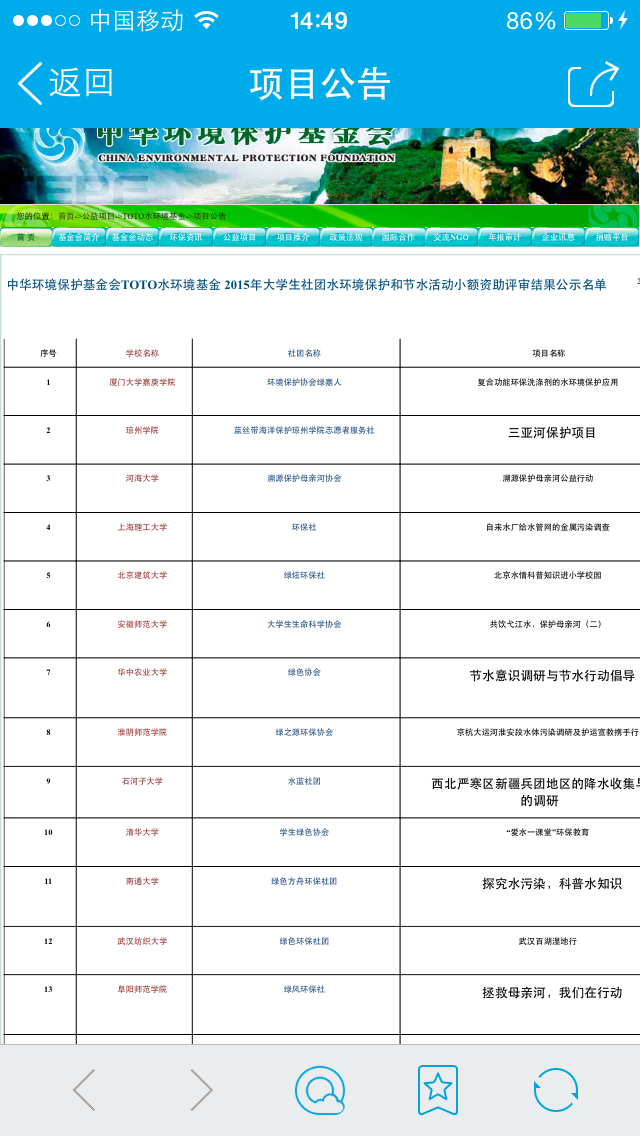 2015年9月22日,从中华环境保护基金会传来喜讯,绿色环保协会成功中标2015年TOTO水环境保护和节水项目,成为此次竞标成功的全国30家老员工环保社团中的一支。