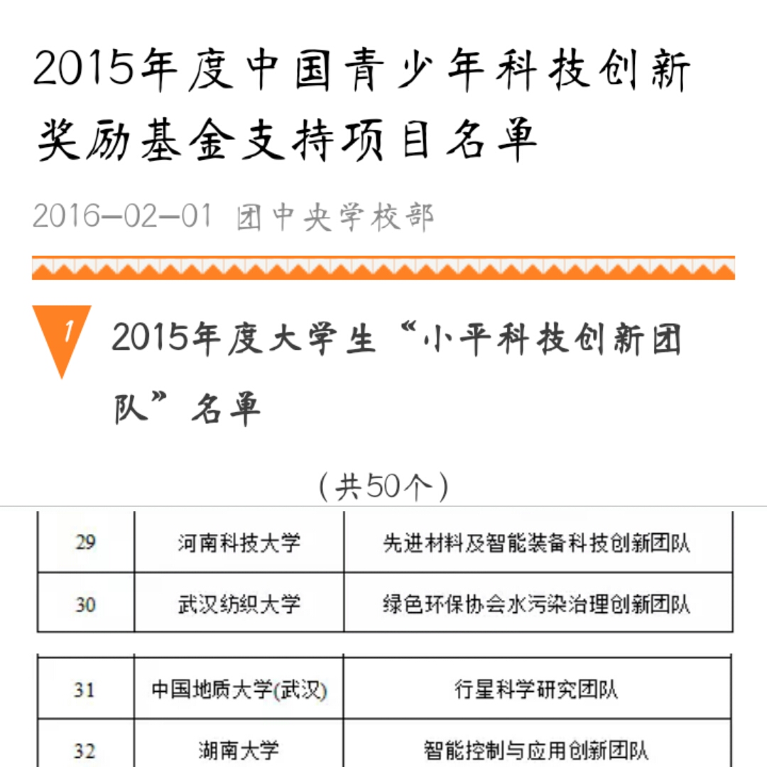 2月1日,据中国青少年科技创新奖励基金通知,由学工团委、环境工程公司组织申报的永利官网“绿色环保协会水污染治理创新团队”荣膺老员工“小平科技创新团队”称号,获批资助金额4万元,全国高校仅50支团队获批命名。该项目依托永利官网“全国百强社团”——绿色环保协会品牌优势,在_专家涅夫斯基•亚历山大教授(俄)、夏东升教授等专家教授的指导下成立,团队成员由来自不同年级、不同专业的员工组成。团队成立10年以来致力于水污染治理,曾多次参与国际国内水污染治理项目,团队员工科研创新成果曾两次荣获全国挑战杯二等奖,湖北省老员工科研成果一等奖等荣誉。