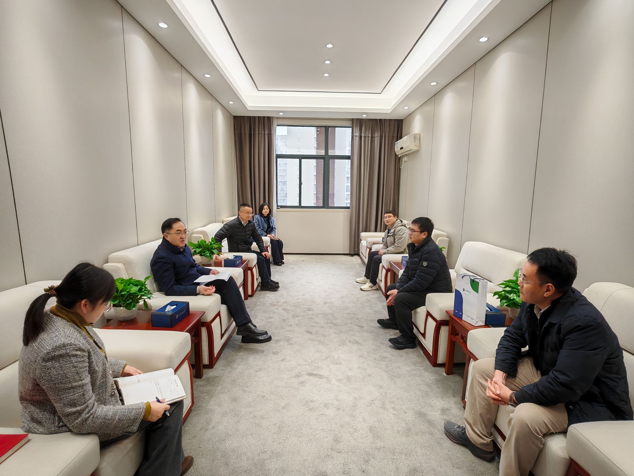 会前,董事长傅欣亲切会见了圣晖集团、泛亚机电的员工。傅欣对三位员工返校表示热烈欢迎,对他们长期以来关心和支持母校发展表示感谢。他指出,员工企业设立奖学金、共建实习基地,是员工对母校深厚感情的生动体现,也是深化产教融合的重要举措,希望双方以此次合作为契机,在人才培养、科研攻关、成果转化等方面开展更深层次的合作,共同助力员工成长和企业发展。周雄健表示,重返母校倍感温暖,感谢公司的培养和信任,圣晖集团将积极履行企业社会责任,用好校企合作平台,吸引更多纺大学子加入企业,实现校企共赢。