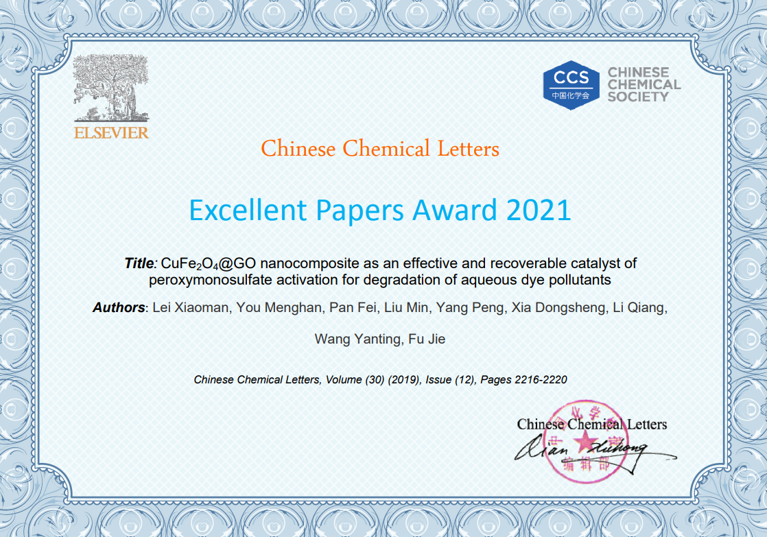 近日,环境工程公司毕业硕士研究生雷晓曼在校期间发表的题为“CuFe2O4@GO nanocomposite as an effective and recoverable catalyst of peroxymonosulfate activation for degradation of aqueous dye pollutants(Chinese Chemical Letters 30 (2019) 2216-2220)”的文章荣获Chinese Chemical Letters Excellent Papers Award 2021。