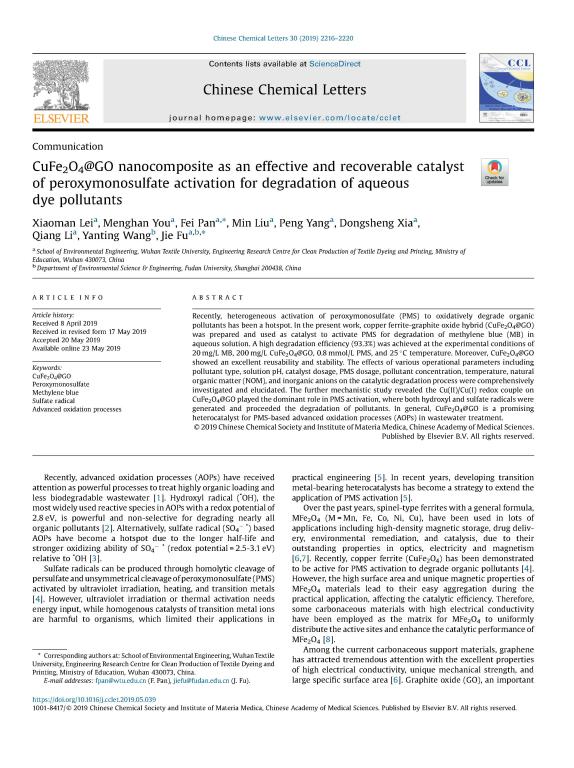 该研究采用一步式溶胶-凝胶燃烧法成功制备出具有磁性的复合材料CuFe2O4@GO,亚甲基蓝(MB)作为降解污染物;研究结果表明:在CuFe2O4@GO + PMS体系中,加入氧化剂PMS反应30min后,MB的去除率为93.4%。该材料具有磁性便于回收利用,经过5次循环重复实验MB的去除率为81.1%,且离子溶出较少。自由基淬灭实验和EPR测试表明CuFe2O4@GO +PMS降解MB体系中的活性自由基为SO4·-和·OH,且SO4·-起到主要作用;从CuFe2O4@GO反应前后的XPS测试结果可以看出,CuFe2O4@GO中的铁离子在反应前后的价态未发生改变,而铜离子在反应过程中存在价态的变化,即Cu2+-Cu3+-Cu+之间的氧化还原反应,这也是该体系PMS被活化的主要机制。该论文以永利官网环境工程公司为第一完成单位,雷晓曼同学为第一作者,潘飞老师为通讯作者。