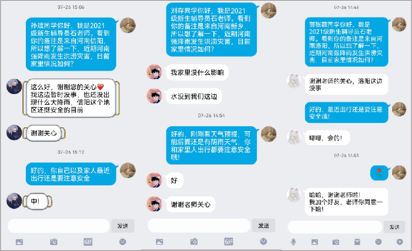 虽未进校门,但已是一家人。公司将排查延伸到了2021级新生,石伊可通过QQ与河南籍新生一一取得联系,询问灾情、提醒出行安全,同时鼓励大家利用假期加强学习、充实自己。来自信阳的建环专业新生孙斌感动的说,“感谢公司的关心,没想到公司老师都这么好,中!”