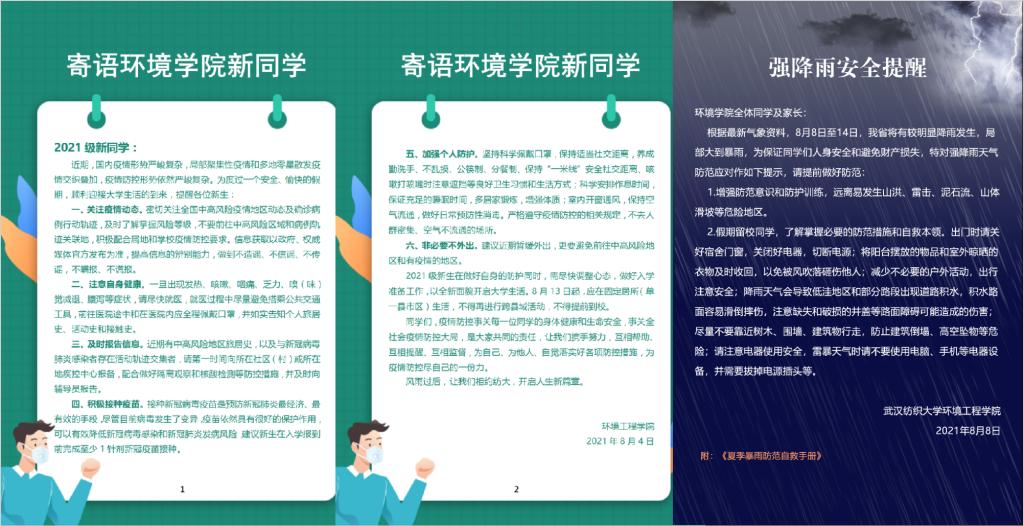 当前,国内疫情形势严峻复杂,局部聚集性疫情和多地零星散发疫情交织叠加,为提醒新生加强防护,确保按时健康入学,公司制作了《寄语环境员工新同学》《强降雨安全提醒》等海报,以公告形式发送至新生群,要求同学们点击公告确认收到。提醒大家关注疫情动态、及时报告信息、积极接种疫苗、加强个人防护、非必要不外出等,在条件允许的前提下,适当参与志愿服务活动,展现环境学子的责任与担当。