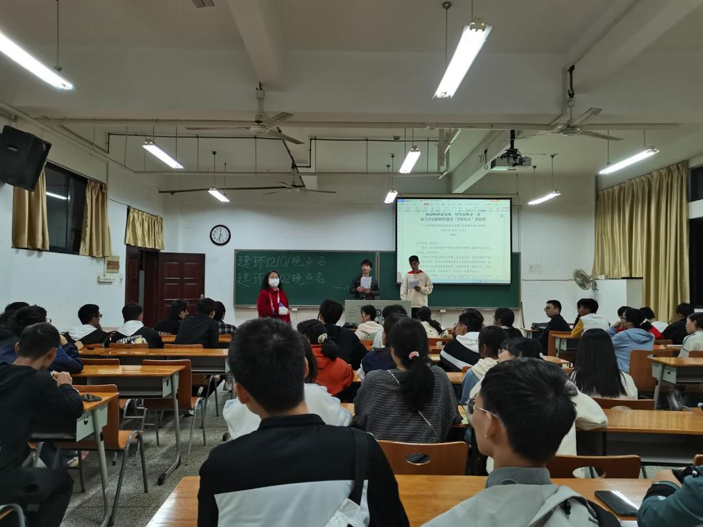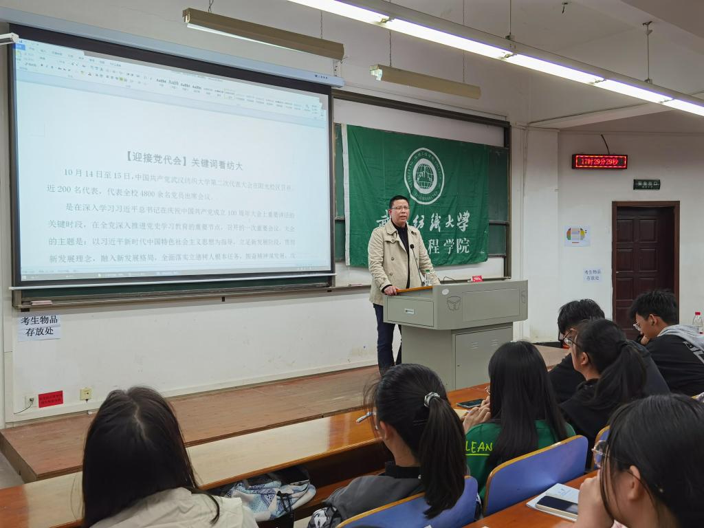 10月17日下午,副书记刘园美在3-T102教室与全体2021级同学一起回顾了“关键词看纺大”系列内容,他对ESI学科、省优势特色学科群、湖北“国内一流学科”建设高校、国家一流专业等72个党建思政、人才培养、科学研究、社会服务、文化传承与创新、国际交流合作等方面的内容一一解读,向同学们介绍了七年多来公司的发展成就,增强大家对专业的自信和爱校荣校自豪感。