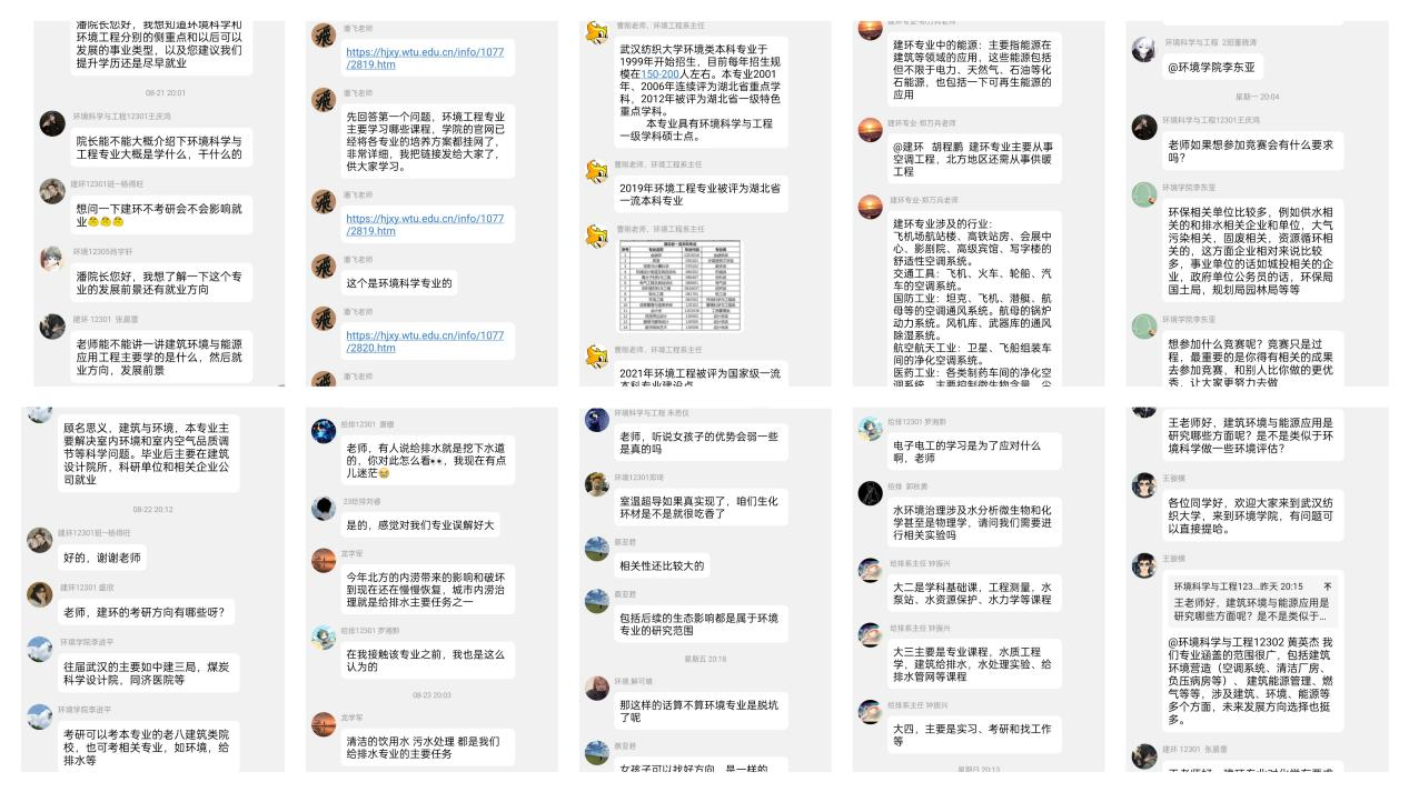 来自环境12303班的范子铭同学说:“通过线上答疑,让我了解了环境工程专业的就业前景和学科发展,让我立志从大一做准备,攻读硕士学位走入更深知识领域。”建环12101班盛欣同学表示:“通过与多位老师的答疑交流,让我对考研的公司选择和研究方向有了进一步的认识,教授们通过专业的术语,生动形象地举例,引领我们探索了解自己所学专业,激发我们对专业的兴趣和对老员工活的期待,这让我受益匪浅。”其他同学们也纷纷留言表示,通过老师们的介绍,让自己对专业有了更深了解,对未来充满信心!