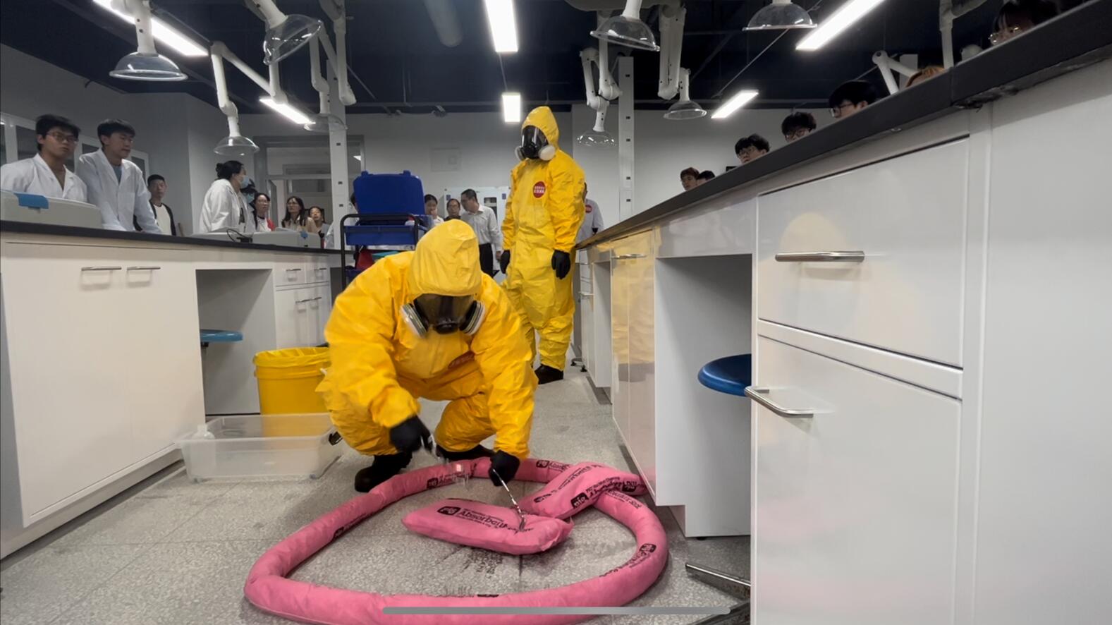 本次演练主要内容是模拟实验室中浓硝酸发生泄漏的情况,检验师生在面对突发安全事故时的应急反应和处理能力。通过实践操作,使师生更加熟悉应急疏散和应急处理流程,提高安全意识,防范安全事故的发生。