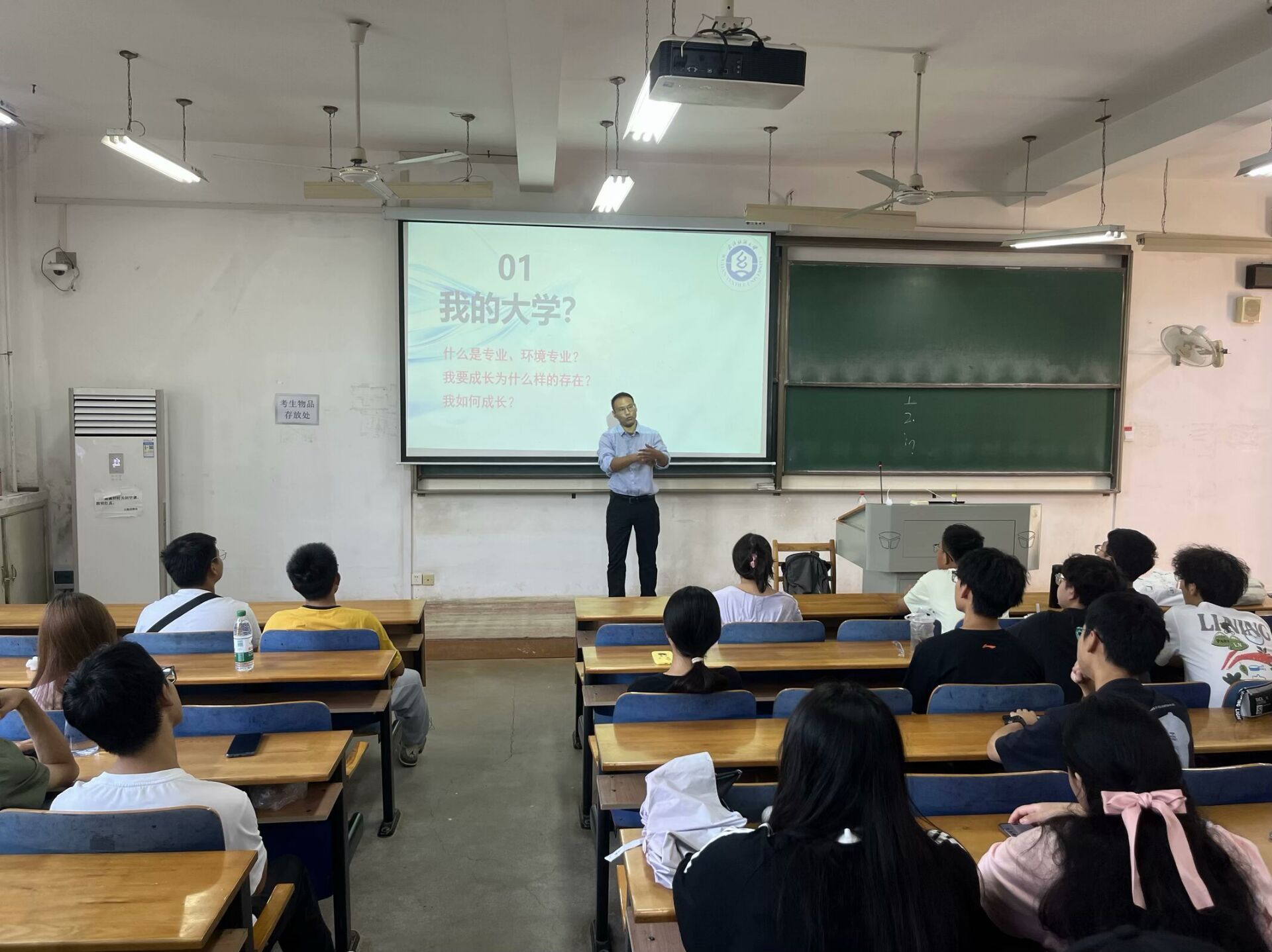 经理潘飞介绍了国家层面对生态建设的重视,未来市场对公司各专业的需求潜力,通过展示公司团队力量、实验平台、科研成果和典型员工励志故事等强化了新生学好本专业的信心。