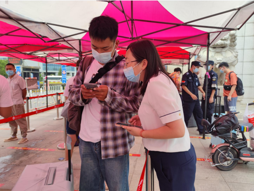在公司东大门,公司党委副书记姚瑶、公司辅导员老师郁星顶着烈日,一一核查进校同学们的健康码、行程卡,遇到对进校流程不清楚和特殊情况的同学,及时快速提供帮助,减少员工等待时间。