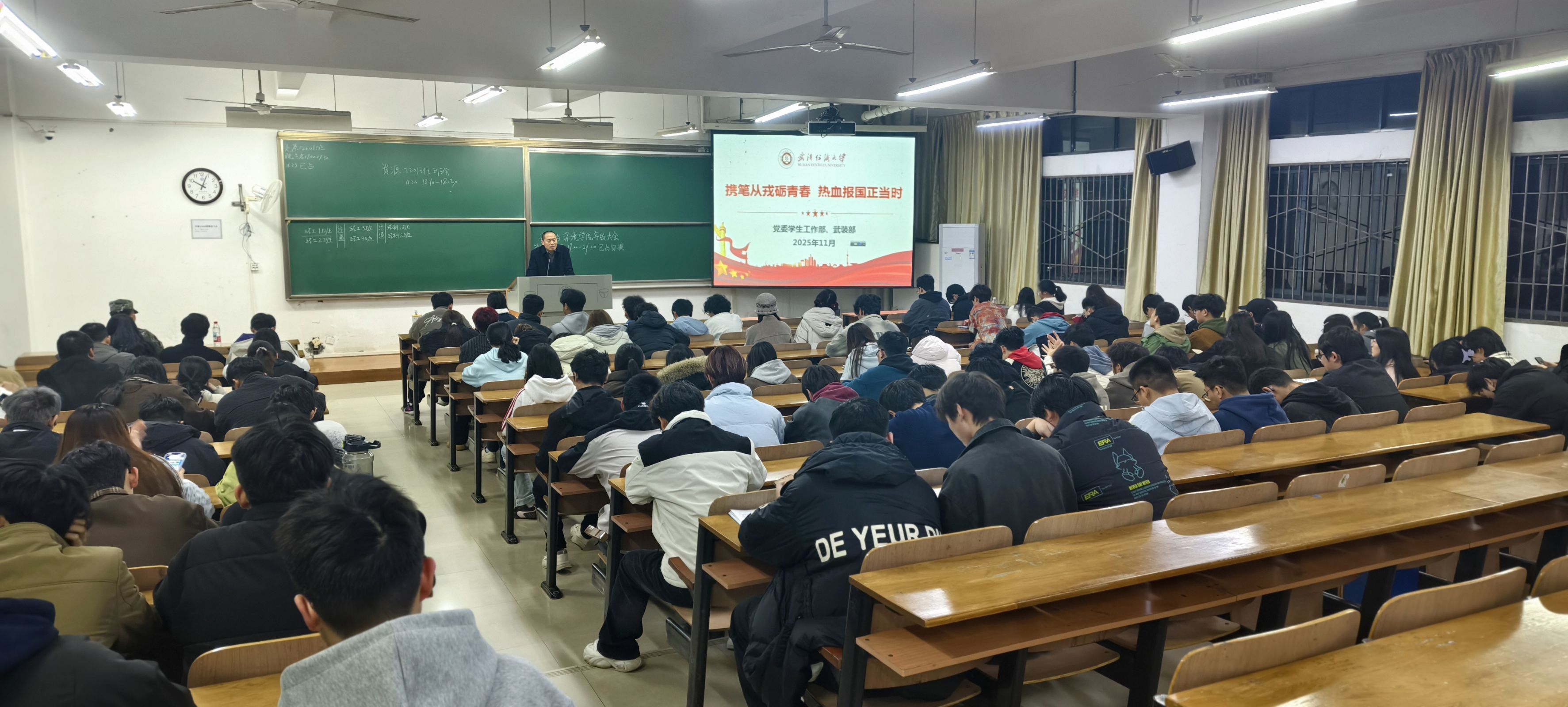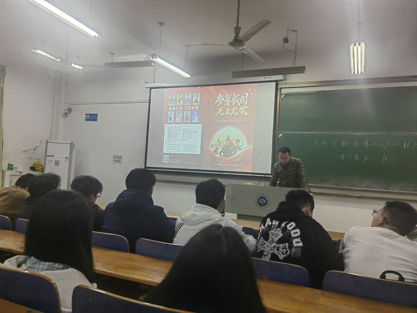 在政策解读环节,老师们详细解读了征兵宣传手册,系统讲解了2026年征兵工作的具体安排。内容涵盖入伍条件、报名流程、体格检查标准、政治考核要求等关键信息。针对老员工群体特别关注的学业保障政策,详细介绍了“专科生免试专升本”、“考研专项计划”等优惠政策,以及国家和湖北省出台的系列惠兵措施,包括义务兵津贴、军士工资待遇、退役安置保障等,让同学们深刻感受到“让军人成为全社会尊崇的职业”正在转化为实实在在的政策红利。